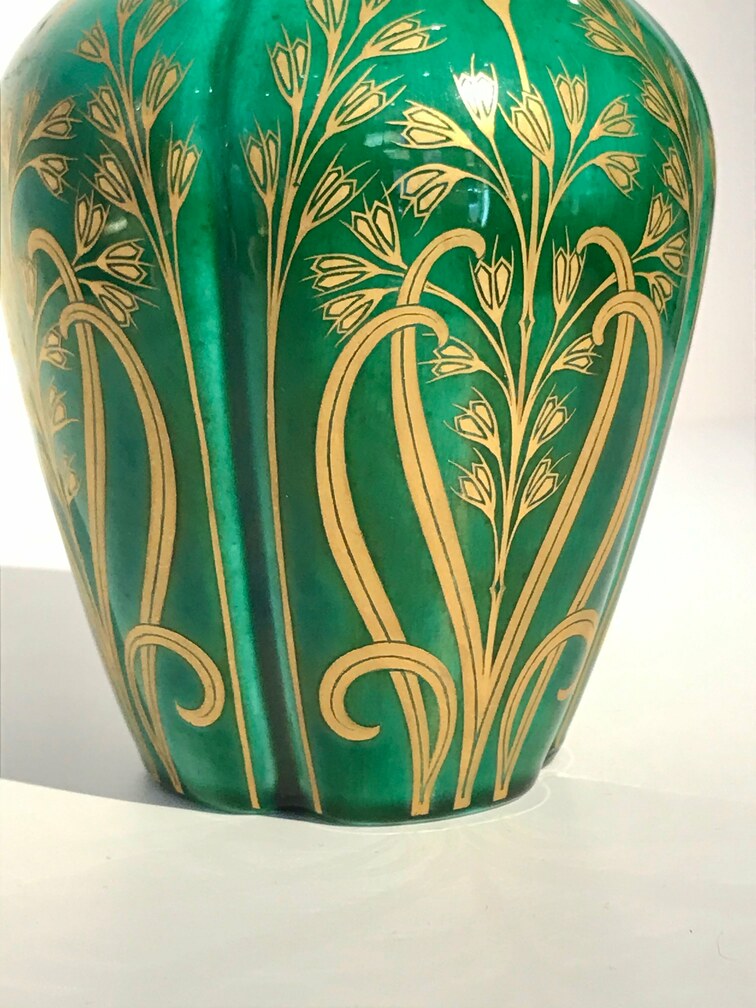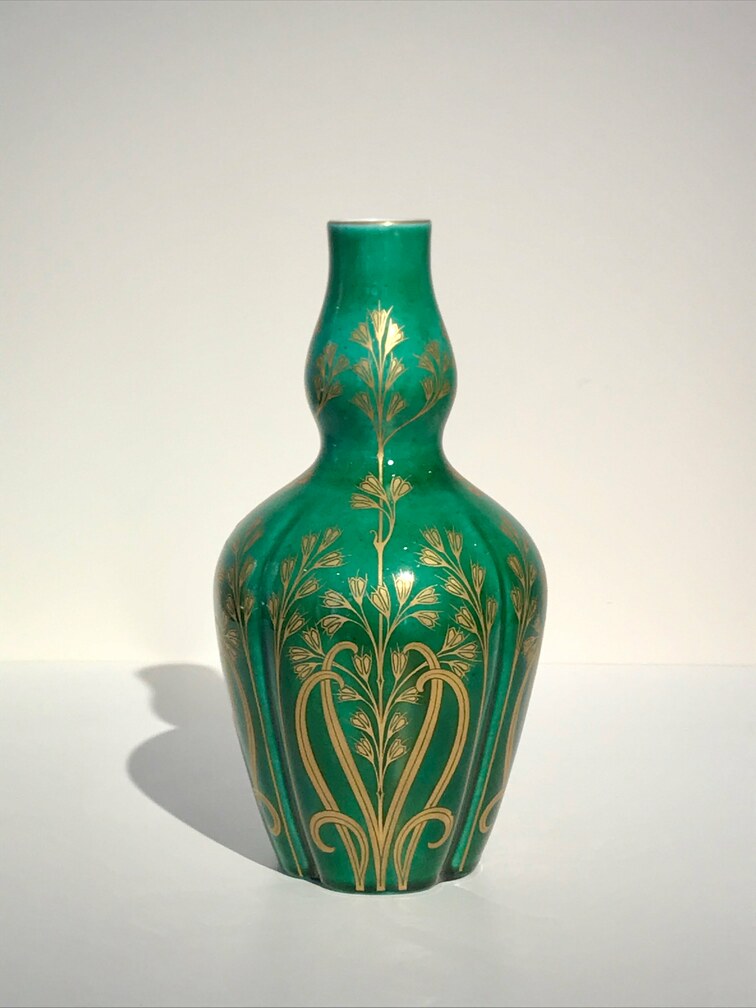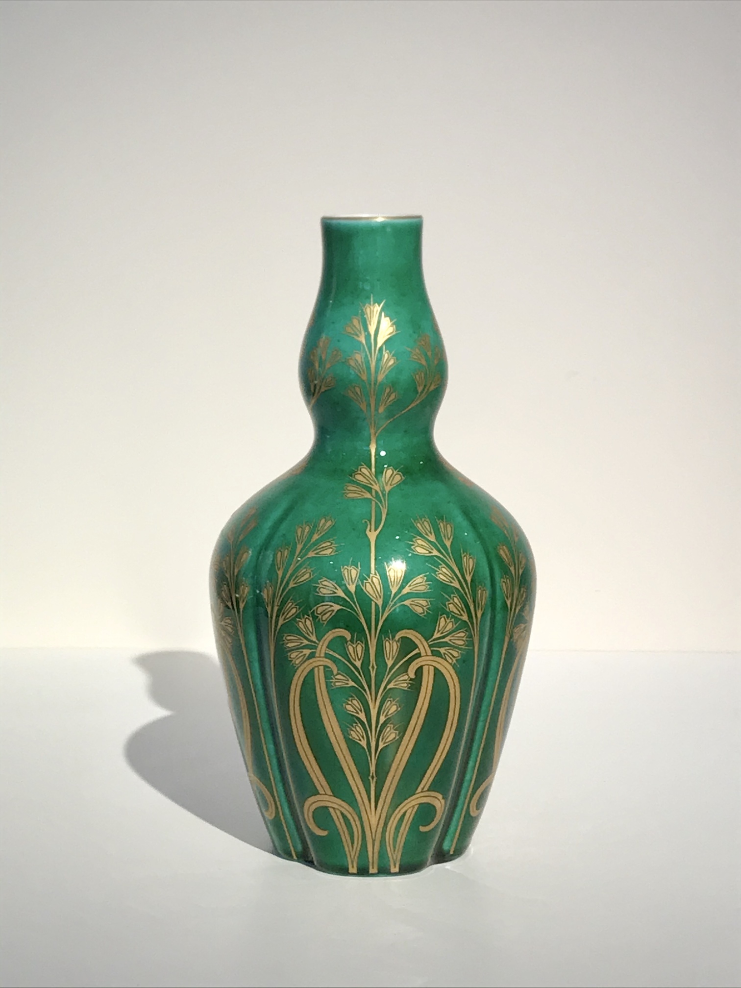 Small soft-paste porcelain vase in the shape of a stylised gourd, with a ‘fresh’ green glazed base and a design of grass stalks (sweet vernal grass) painted in gold