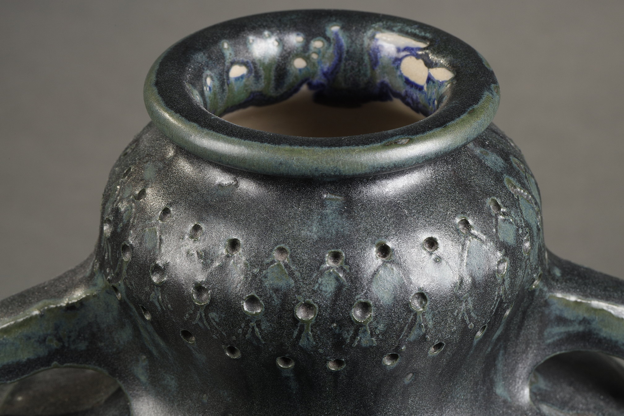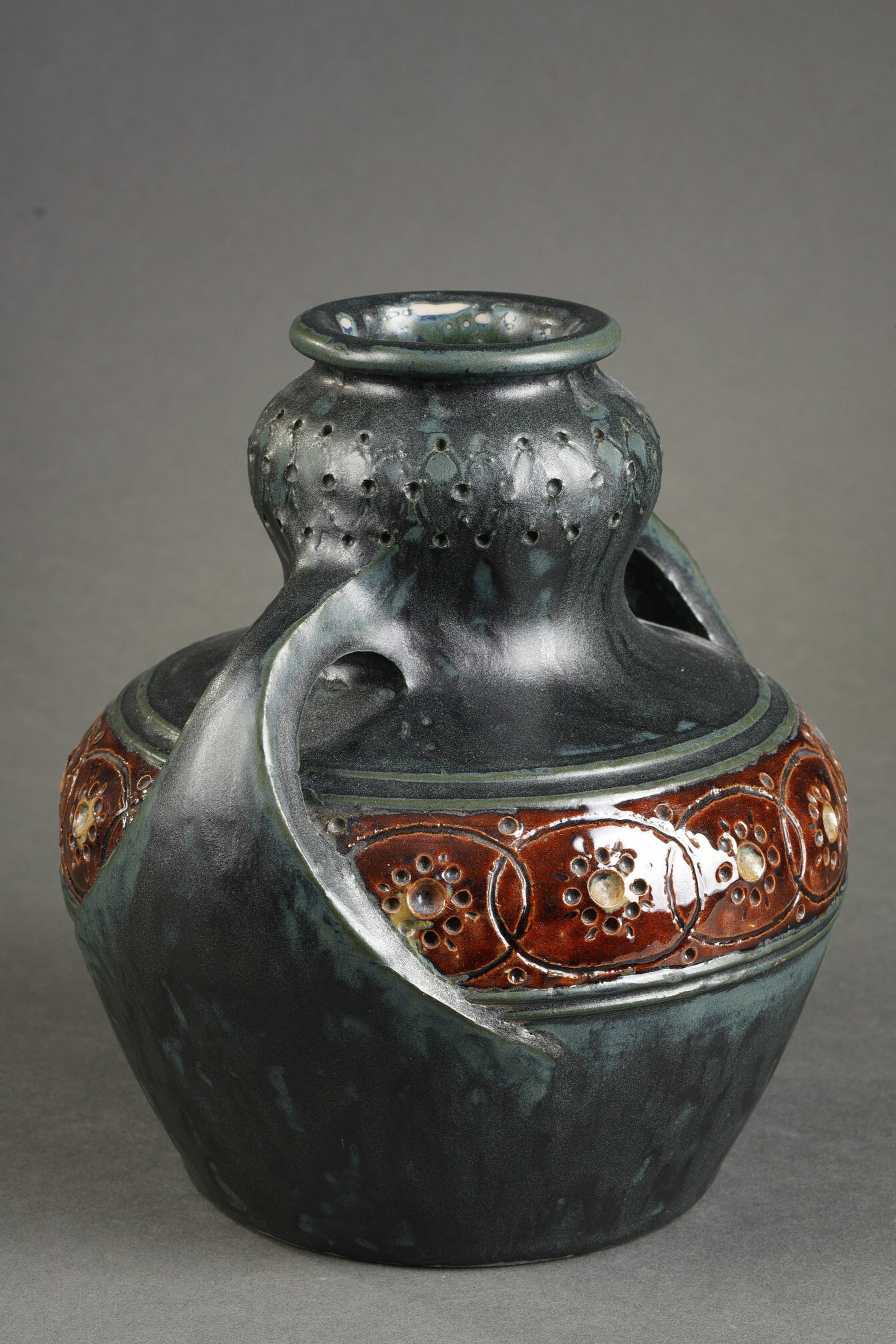 Vase à anses en grès fin émaillé avec un décor en creux de motifs géométriques émaillés brillant sur fond brun foncé émaillé mat