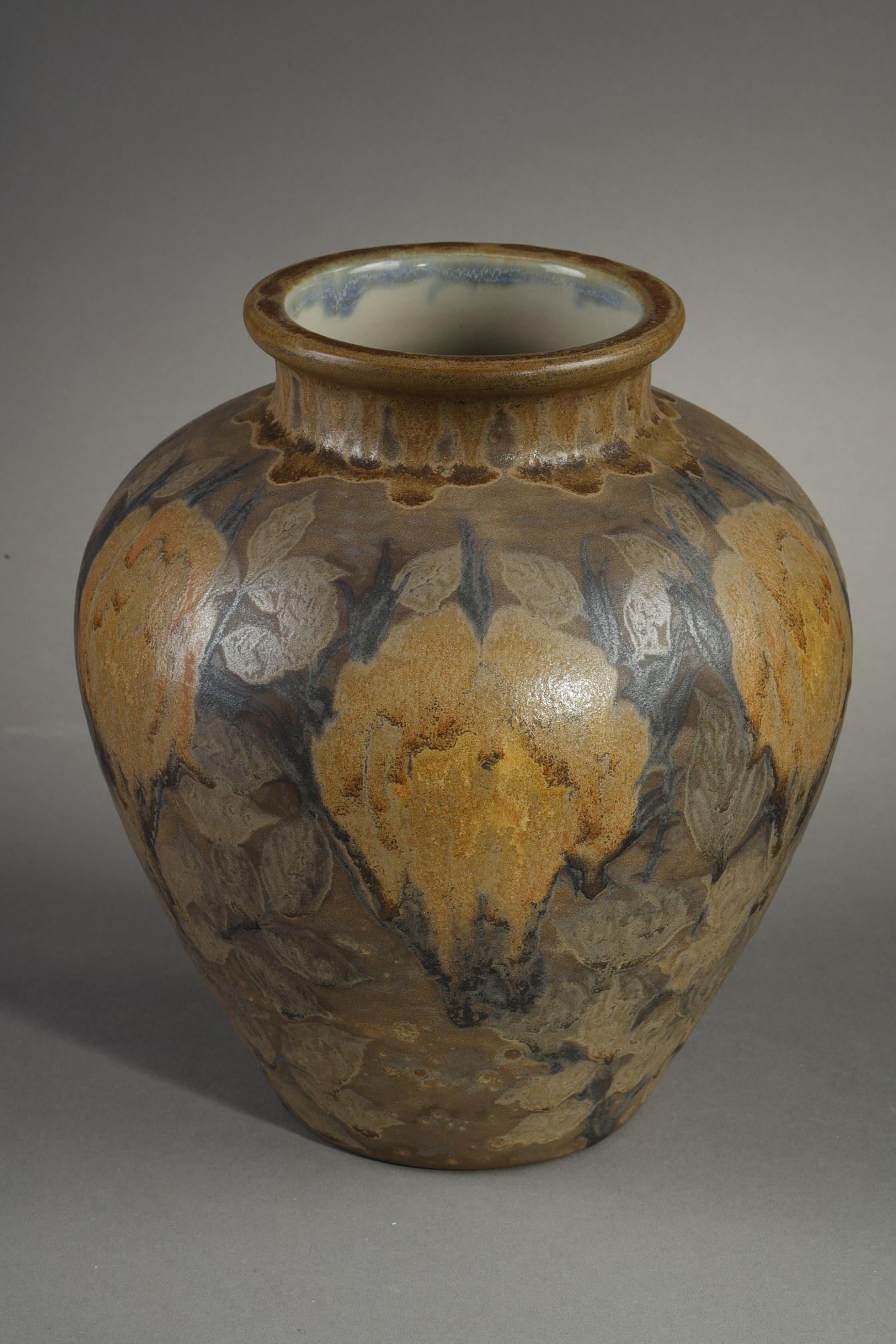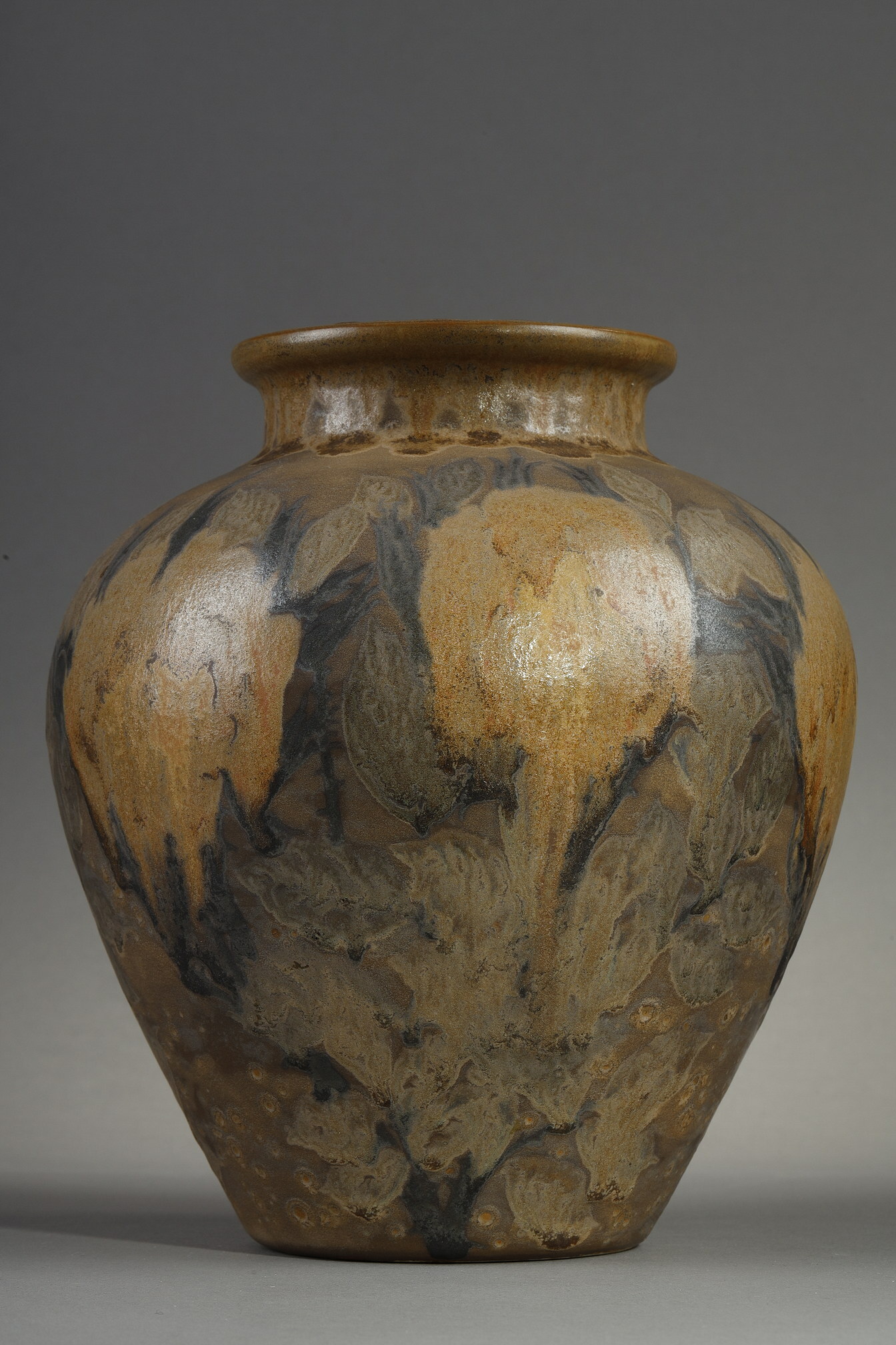 Narrow-necked vase in glazed stoneware with painted relief decoration of roses on stems in light brown and green on a shaded brown background